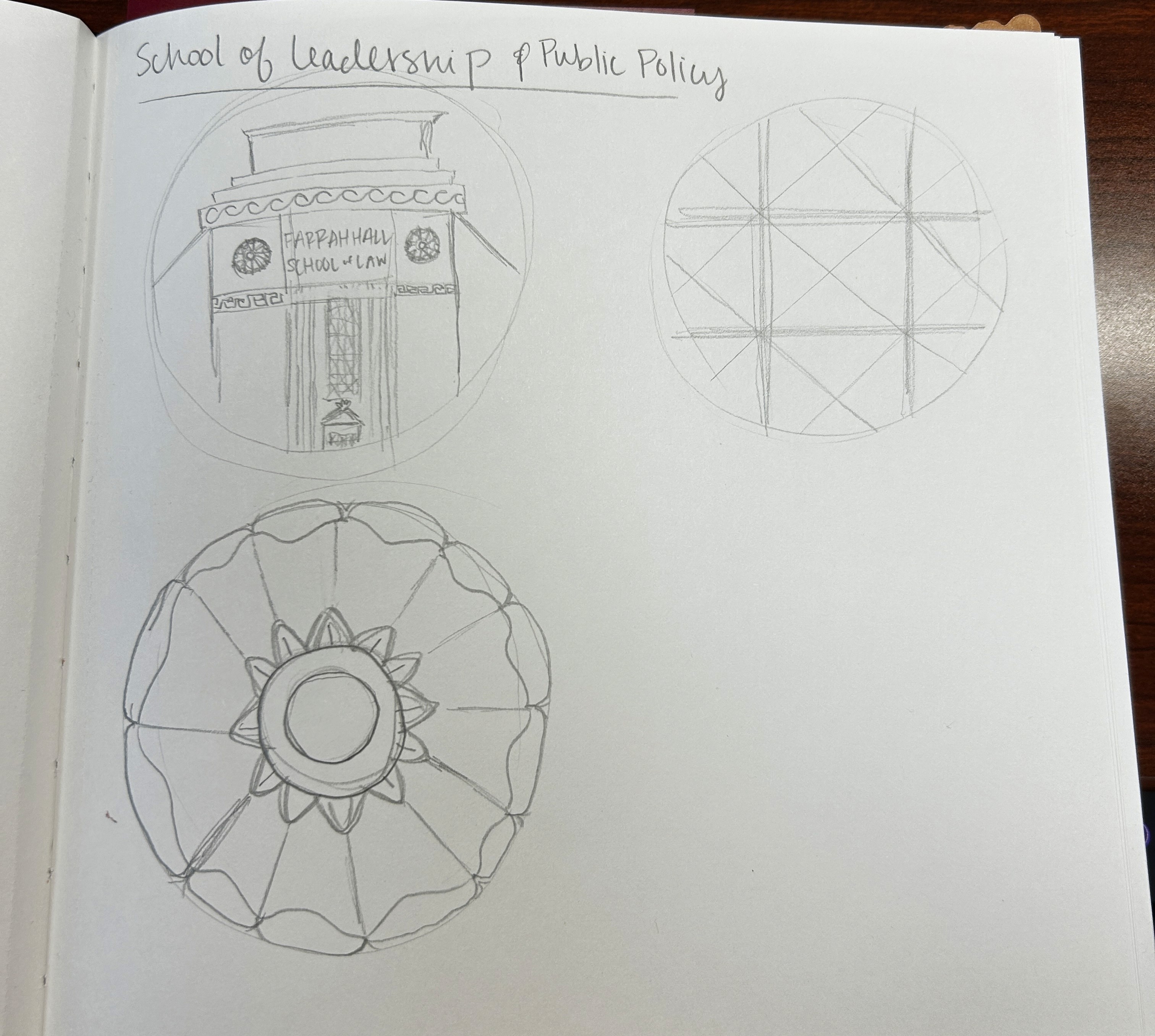 The design draws directly from Farrah Hall, the building that houses the school, incorporating a repeating pattern inspired by its distinctive window architecture to ground the mark in a physical sense of place. At the center, a torch serves as the primary symbol, representing leadership, guidance, and the pursuit of knowledge. By blending classical seal conventions with architectural references and clean, intentional symbolism, the final mark balances heritage and progress, creating a meaningful emblem that reflects both the academic rigor and aspirational mission of the School of Leadership and Policy.